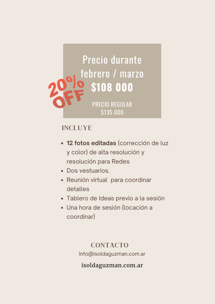 - En caso de querer fotos extras, el valor adicional por cada foto es de $10 000 y se abona cuando hayas hecho tu selección de fotos.
